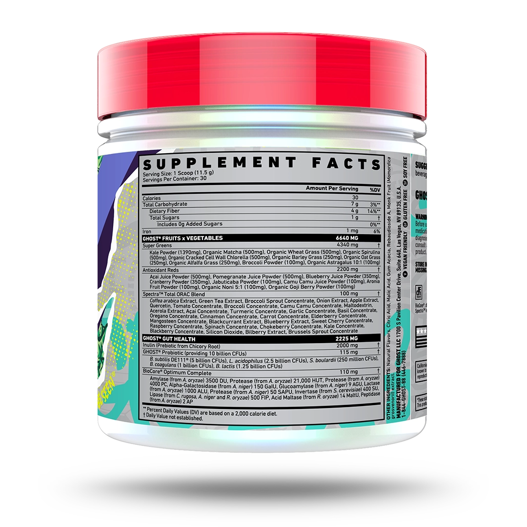 It’s easier than ever to get your fruits and veggies in! GHOST® GREENS combines 19 individually sourced Greens and Reds with a full 100mg dose of Spectra™, Prebiotics, 10 billion CFU Probiotic and the super-premium BioCore® Optimum Complete Digestive Enzymes.